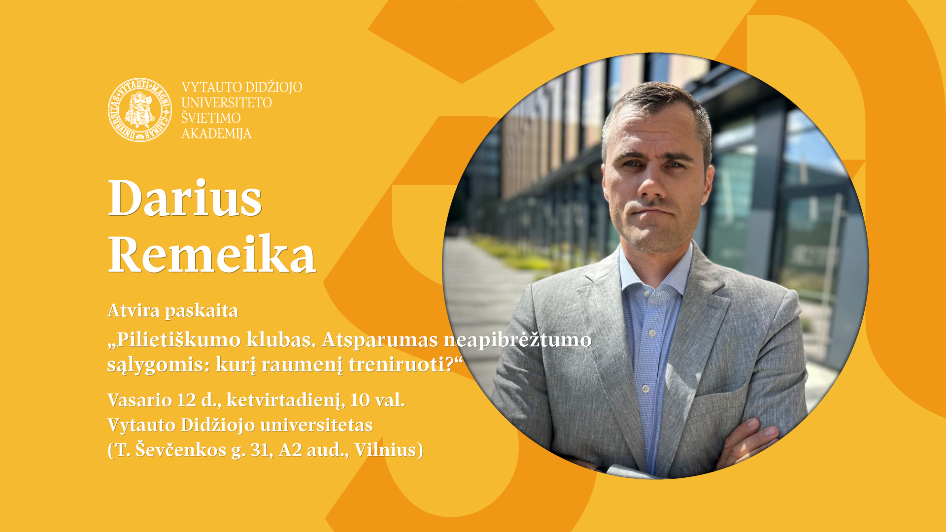 Vasario 12 d., ketvirtadienį, 10 val., VDU Švietimo akademijoje (T. Ševčenkos g. 31, A2 aud.) vyks Pilietiškumo klubas, kur vyks informacinių karų eksperto, karininko, VDU doktoranto ir dėstytojo Dariaus Remeikos atvira paskaita „Atsparumas neapibrėžtumo sąlygomis: kurį raumenį treniruoti?“.