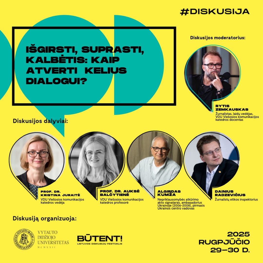 Pokalbis „Išgirsti, suprasti, kalbėtis: kaip atverti kelius dialogui?“ vyks rugpjūčio 29 d., 15.30–16.30 val. Joje – apie susikalbėjimo ir įtraukaus dialogo paieškas susipriešinusioje visuomenėje, dialogo spragas viešojoje komunikacijoje. Kalbėsis: VDU Viešosios komunikacijos katedros vedėja prof. dr. Kristina Juraitė, VDU Viešosios komunikacijos katedros profesorė Auksė Balčytienė, Nepriklausomybės atkūrimo akto signataras, ambasadorius Ukrainoje (2006–2008), pirmasis Ukrainos centro vadovas Algirdas Kumža, Žurnalistų etikos inspektorius Dainius Radzevičius. Moderatorius: VDU Viešosios komunikacijos katedros docentas, žurnalistas, laidų vedėjas Rytis Zemkauskas.