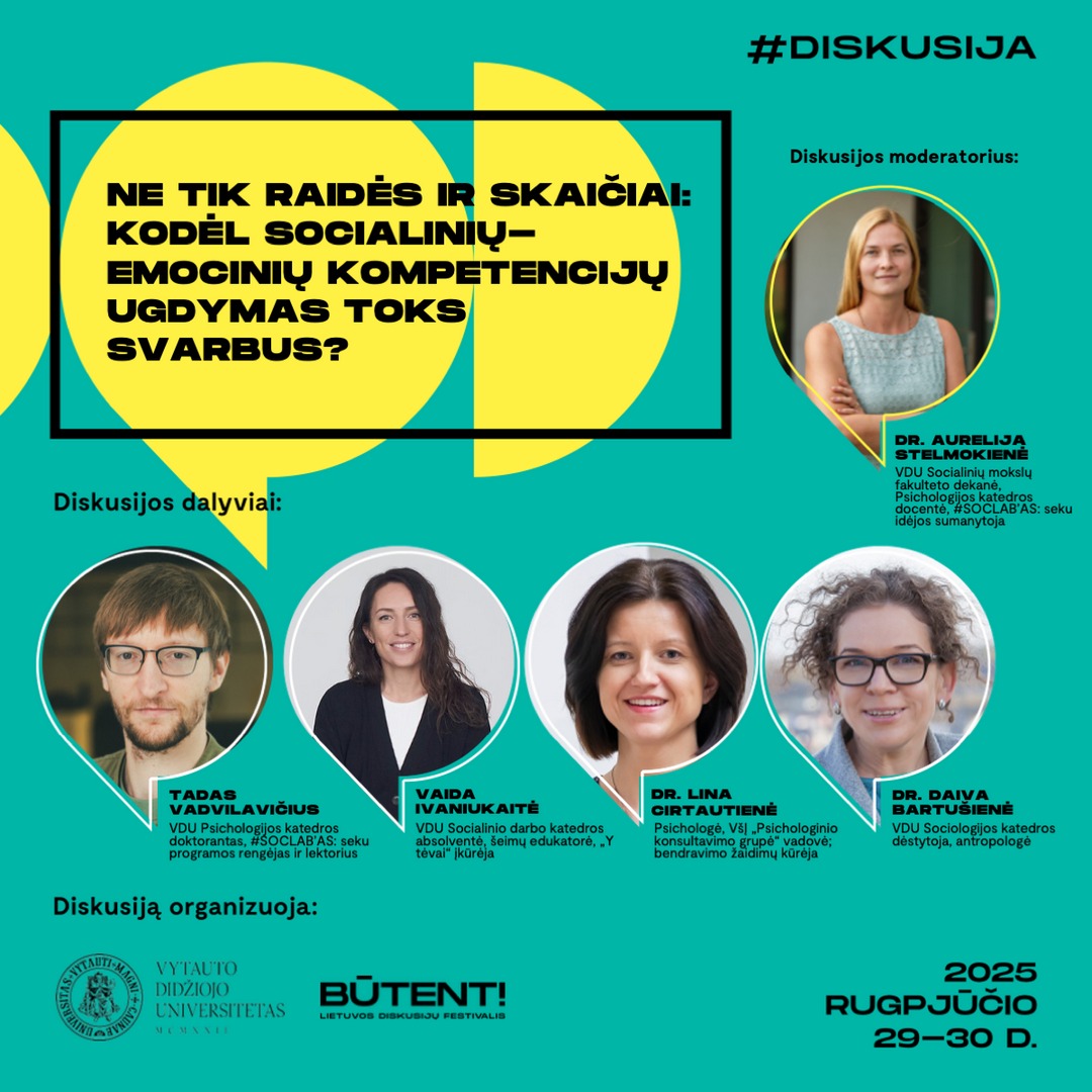 Diskusija „Ne tik raidės ir skaičiai: kodėl socialinių-emocinių kompetencijų ugdymas toks svarbus?“ (rugpjūčio 30 d., 11–12 val.) kvies aptarti empatijos, bendradarbiavimo ir kitų socialinių-emocinių kompetencijų svarbą. Renginyje kalbėsis VDU Psichologijos katedros doktorantas Tadas Vadvilavičius, VDU absolventė, šeimų edukatorė Vaida Ivaniukaitė, VšĮ „Psichologinio konsultavimo grupė“ vadovė dr. Lina Cirtautienė ir VDU Sociologijos katedros dėstytoja, antropologė dr. Daiva Bartušienė. Moderatorė: VDU Socialinių mokslų fakulteto dekanė doc. dr. Aurelija Stelmokienė.