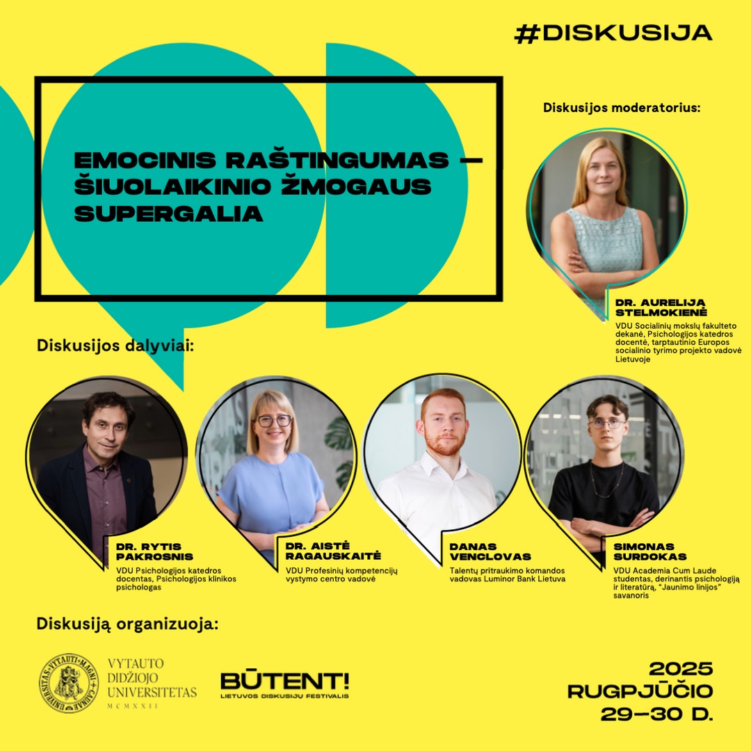 Pokalbis „Emocinis raštingumas – šiuolaikinio žmogaus supergalia“ bus surengtas rugpjūčio 30 d., 12.30–13.30 val. Jis bus skirtas socialinių ir emocinių kompetencijų svarbai suaugusio žmogaus asmeniniame gyvenime ir karjeroje. Diskutantai: VDU Psichologijos katedros docentas dr. Rytis Pakrosnis, VDU Profesinių kompetencijų vystymo centro vadovė dr. Aistė Ragauskaitė, „Luminor“ banko Talentų pritraukimo komandos vadovas Danas Venclovas ir VDU „Academia cum laude“ studentas, derinantis psichologiją ir literatūrą, „Jaunimo linijos“ savanoris Simonas Surdokas. Moderatorė: VDU Socialinių mokslų fakulteto dekanė doc. dr. Aurelija Stelmokienė.