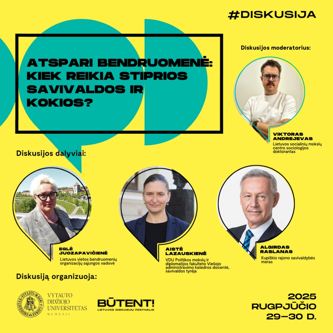Diskusija „Atspari bendruomenė: kiek reikia stiprios savivaldos ir kokios?“ (rugpjūčio 30 d., 14–15 val.) kvies pasigilinti į socialinio atsparumo formavimąsi vietos bendruomenėse. Diskutuos VDU Politikos mokslų ir diplomatijos fakulteto Viešojo administravimo katedros docentė, savivaldos tyrėja Aistė Lazauskienė, Lietuvos vietos bendruomenių organizacijų sąjungos vadovė Eglė Juozapavičienė, Kupiškio rajono savivaldybės meras Algirdas Raslanas. Moderatorius: Lietuvos socialinių mokslų centro sociologijos doktorantas Viktoras Andrejevas.