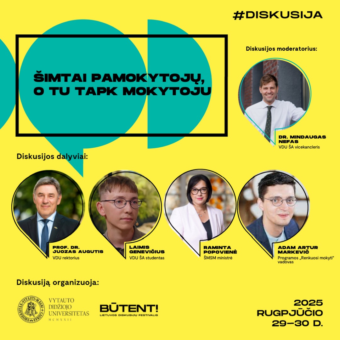 Dar viename festivalio „Būtent!“ renginyje VDU ir kitų institucijų atstovai kalbėsis apie mokslininkus, kurie šiandien yra neatskiriami nuo visuomenės – jie tiria ir kuria žinias, turinčias didelę įtaką mūsų visų kasdienybei: nuo švietimo ir sveikatos iki klimato kaitos ir technologijų. Diskutantai iš naujo pažvelgs į mokslininko vaidmenį, dekonstruos stereotipus ir nagrinės, kaip dar labiau stiprinti ryšį tarp mokslo ir visuomenės.