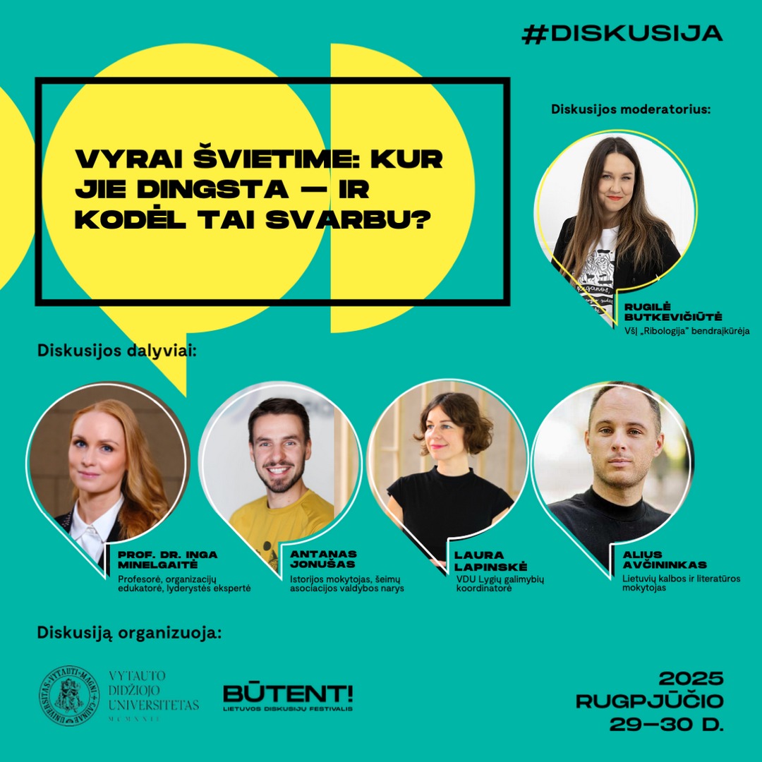 Pokalbyje „Vyrai švietime: kur jie dingsta – ir kodėl tai svarbu?“, kuris vyks rugpjūčio 30 d., 17–18 val., bus aptartas vis retesnis reiškinys – vyrai mokytojai. Renginyje dalyvaus VU Ugdymo mokslo instituto profesorė Irena Stonkuvienė, istorijos mokytojas, šeimų asociacijos valdybos narys Antanas Jonušas, VDU Lygių galimybių koordinatorė Laura Lapinskė ir lietuvių kalbos ir literatūros mokytojas Alius Avčininkas. Moderatorė: VšĮ „Ribologija“ bendraįkūrėja Rugilė Butkevičiūtė.